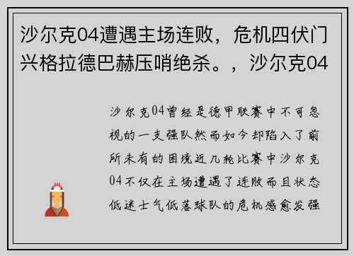 沙尔克04遭遇主场连败,危机四伏门兴格拉德巴赫压哨绝杀。,沙尔克04降级德乙